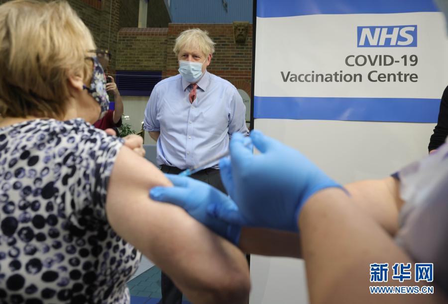 12月8日,英國首相鮑里斯·約翰遜在倫敦一家醫(yī)院的疫苗接種中心觀看一名女子接種疫苗。