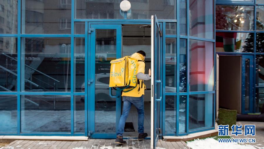 12月10日,在哈薩克斯坦首都努爾蘇丹,一名外賣小哥走進一棟公寓樓為顧客送餐。新華社發(GLOVO公司供圖)