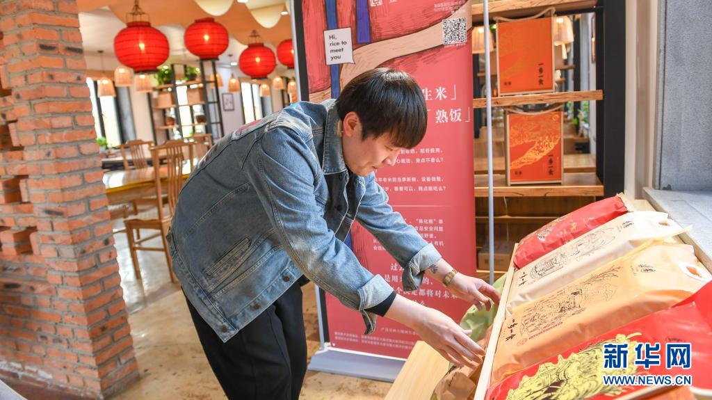 在吉林市船營(yíng)區(qū)大綏河鎮(zhèn),創(chuàng)業(yè)者曹曦將農(nóng)場(chǎng)生產(chǎn)的大米擺在民宿顯眼位置進(jìn)行展示(4月20日攝)。新華社記者 張楠 攝