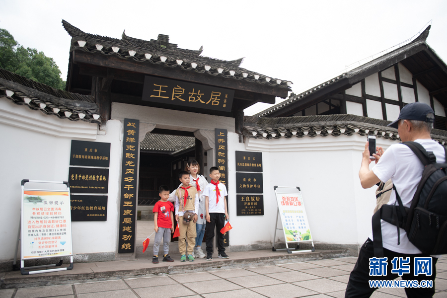 參觀王良故居的小朋友在故居門口合影。新華網 耿駿宇 攝