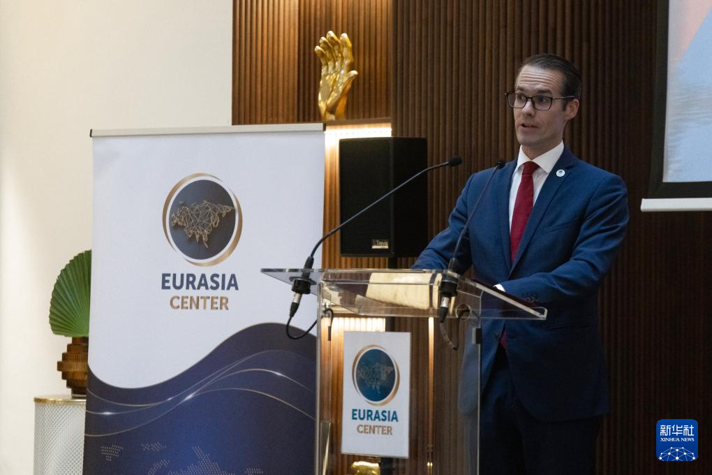 11月24日,在匈牙利布达佩斯,匈牙利约翰·冯·诺伊曼大学欧亚中心主任霍尔瓦特·列文特在首发式上致辞。新华社发(弗尔季·奥蒂洛摄)