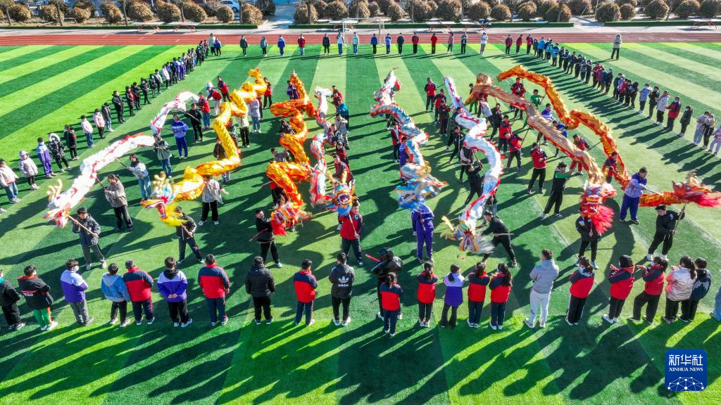 2月20日,河北省遵化市东旧寨镇梁屯中心小学的学生表演舞龙(无人机照片)。
