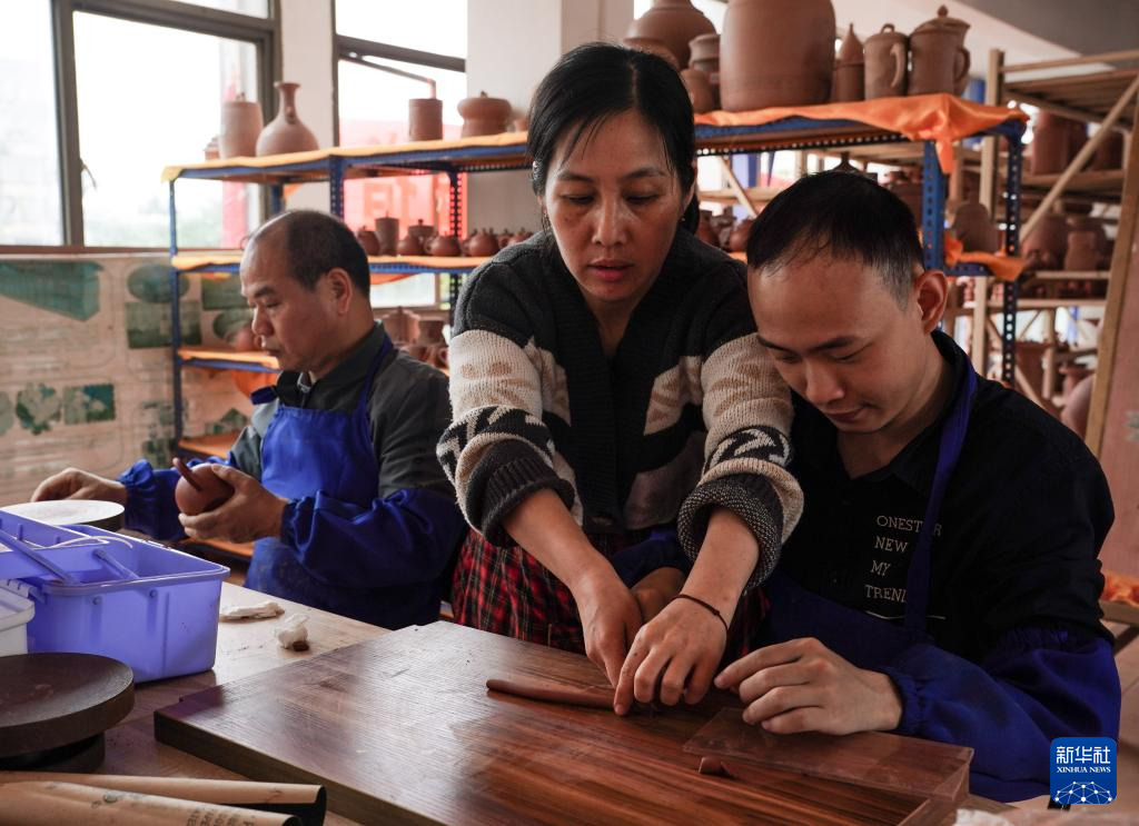 4月11日,在广西钦州市,员工在坭兴陶生产车间工作。