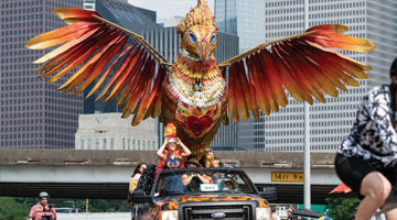 4月18日,文艺工作者在东营市清风湖黄河大集上在表演豫剧《穆桂英挂帅》。