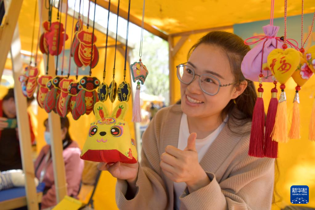 4月18日,非遗传承人在东营市清风湖黄河大集上介绍绒绣兔。