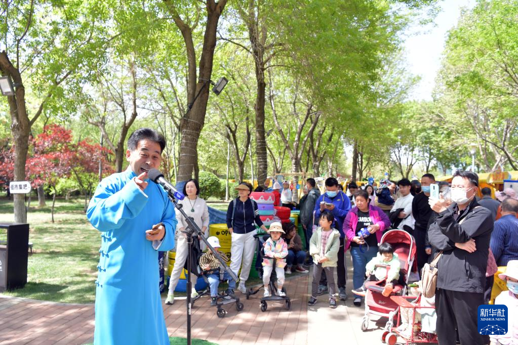 4月18日,文艺工作者在东营市清风湖黄河大集上表演快板。