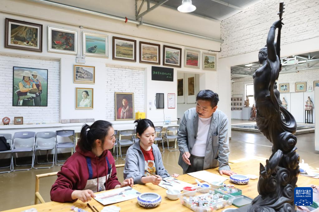 5月11日,敦煌彩塑制作技艺非物质文化遗产传承人杜永卫(右)在位于敦煌市的莫高里工匠村给学员教授绘画技法。