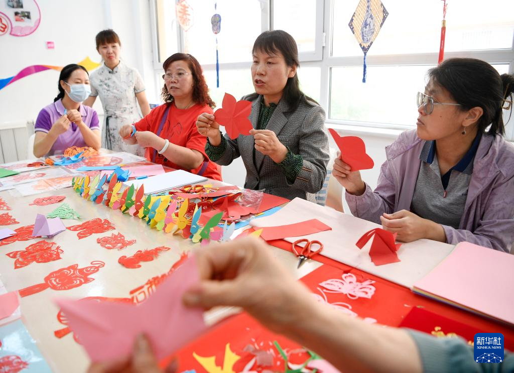 5月17日,老师(右二)向居民传授剪纸技艺。