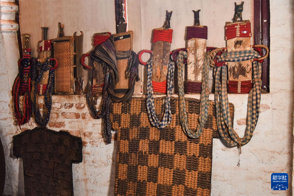 这是4月12日在喀麦隆西部大区丰班的巴蒙王宫博物馆拍摄的过去巴蒙战士使用的武器。