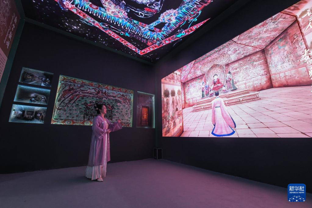 6月8日,在“文旅消费馆·一带一路国际馆”甘肃展台,一位身着古装的观众在观看数字敦煌展览。