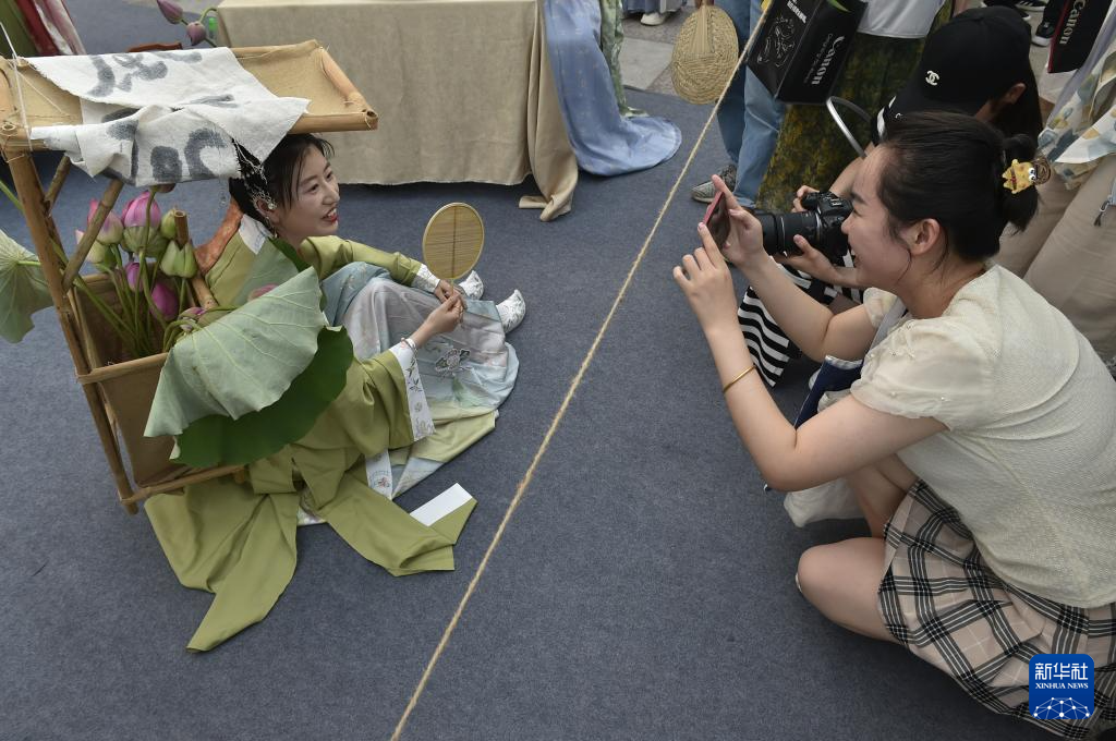7月14日傍晚,身穿古装的游人(左)在开封市开元广场设立的“非遗市集”现场留影。