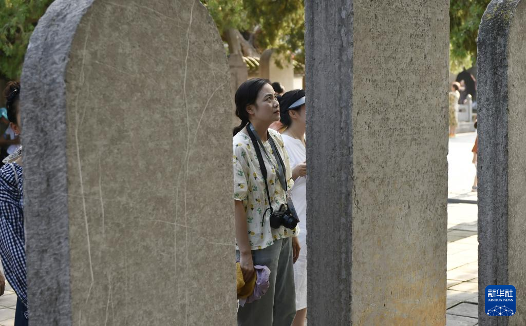 8月7日,游人在嵩阳书院内参观“大唐嵩阳观纪圣德感应之颂碑”。