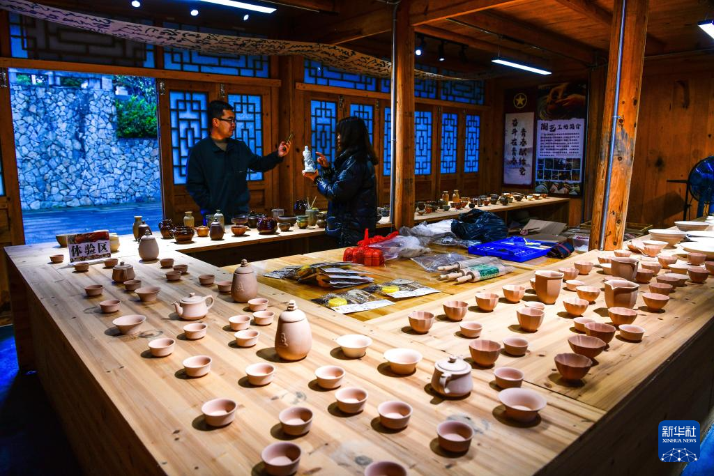 11月15日,帮扶干部在贵州省石阡县国荣乡楼上古寨的文创工坊里拍摄陶艺制品。