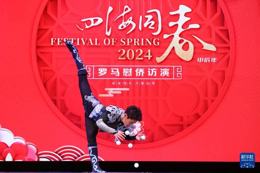 2月19日,演员管利寅在意大利罗马举行的“四海同春”慰侨访演活动上表演杂技。