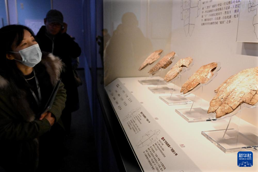 2月26日,参观者在河南安阳殷墟博物馆新馆内观看展出的刻辞卜甲。