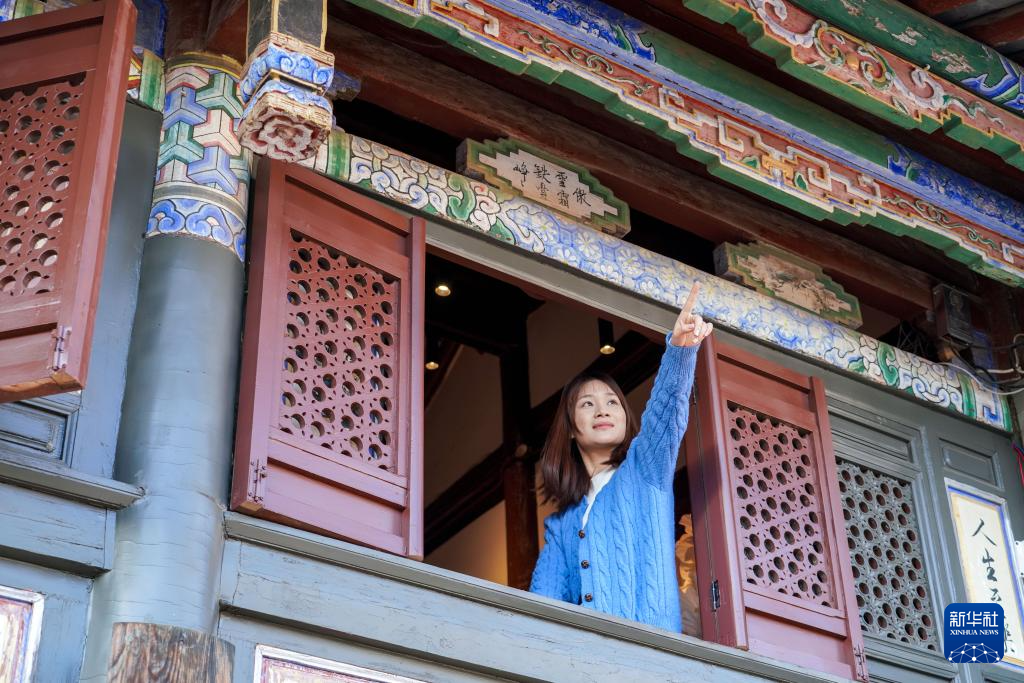 12月8日,游客在官渡古镇“古渡梨园”体验滇剧表演。