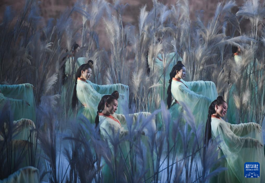 西安大唐芙蓉园内上演的舞台剧《鼓》(2024年1月24日摄)。