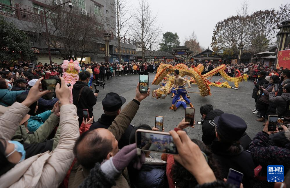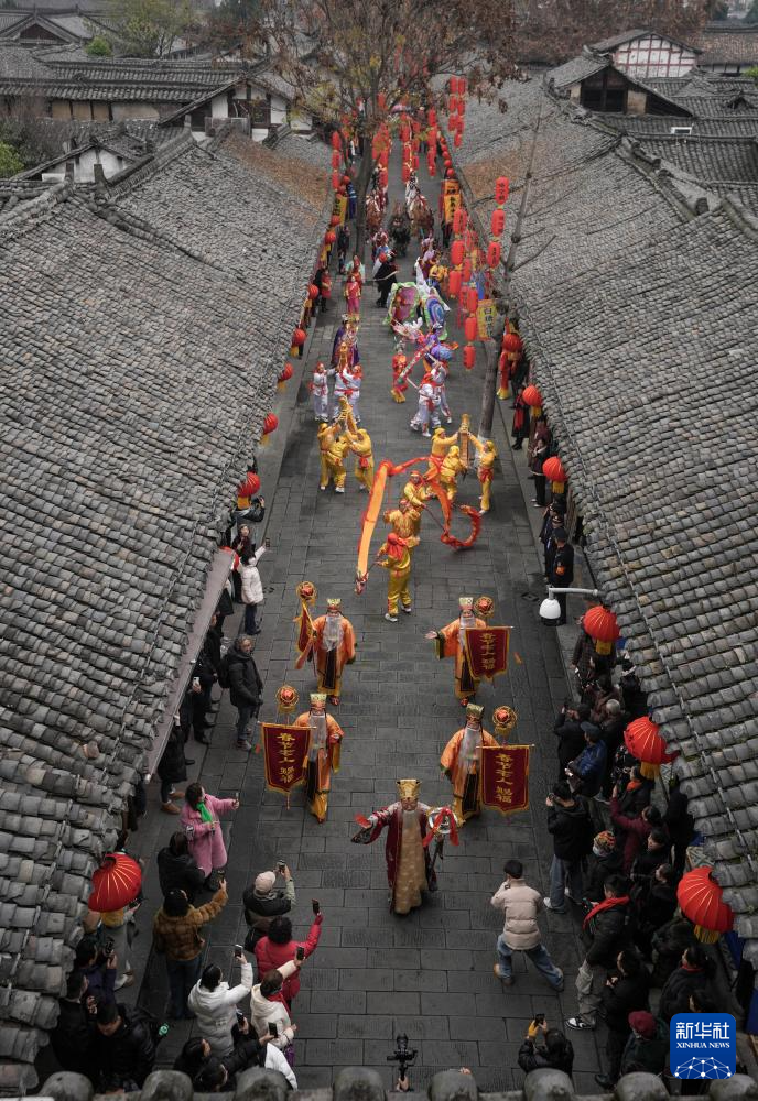 1月7日,人们在阆中古城观看舞龙舞狮。