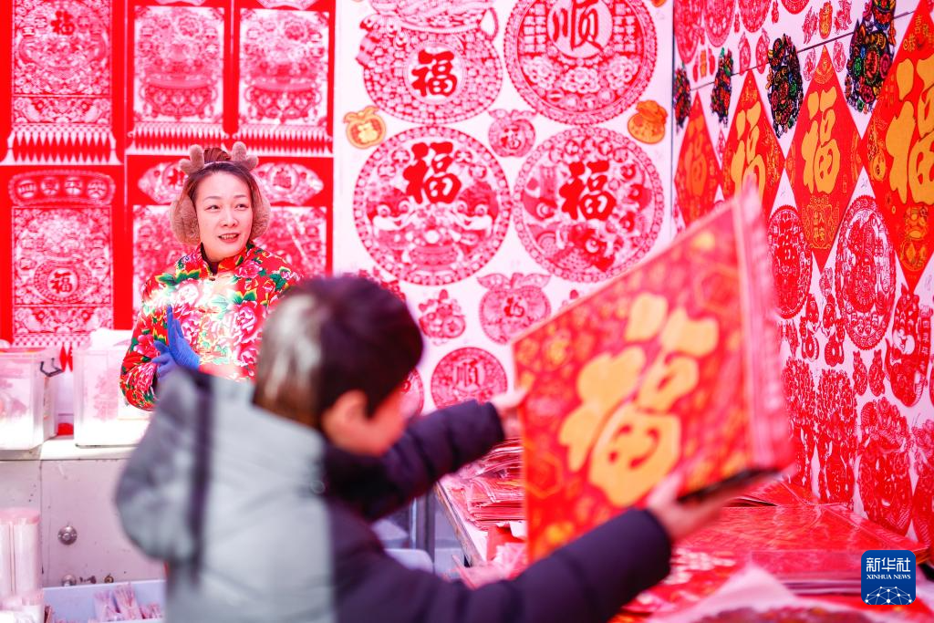 春节临近,大街小巷张灯结彩,人们逛集市、购年货,参加各种迎新年活动。