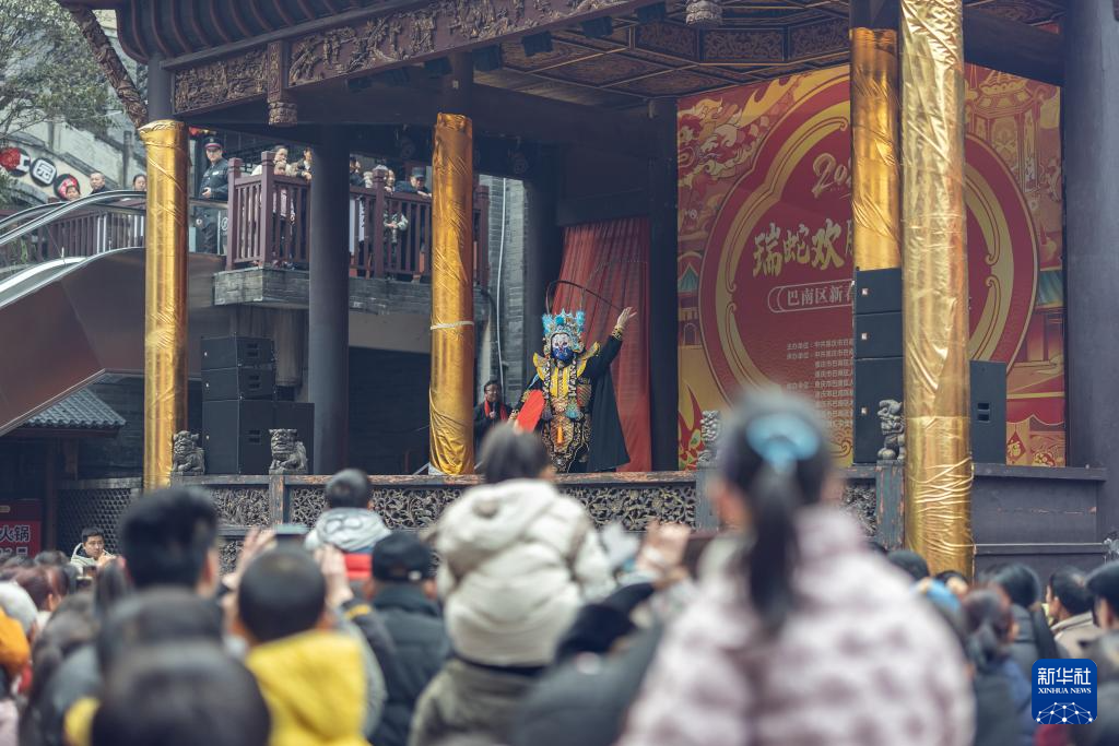 1月21日,观众在重庆市巴南区西流沱小镇观看川剧变脸表演。