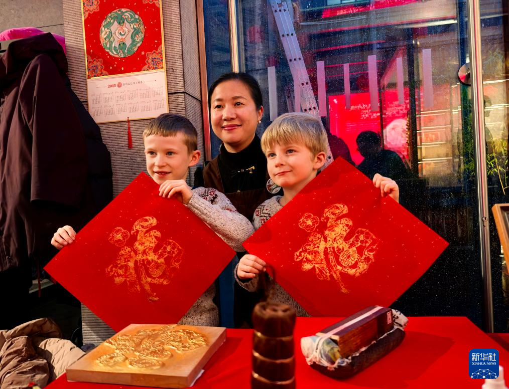 1月24日,在比利时首都布鲁塞尔中国文化中心举行的“欢乐春节·水韵江苏”文化旅游推广活动上,孩子们展示福字。