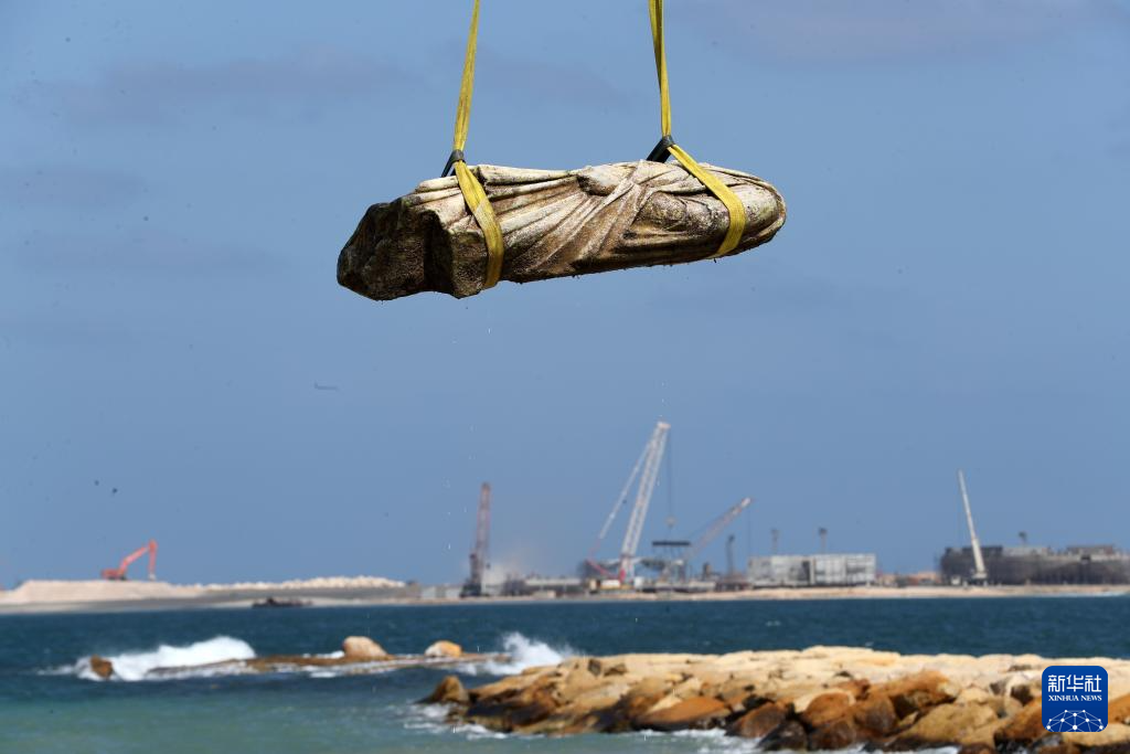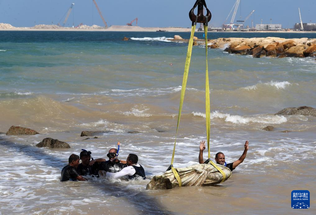 8月21日,在埃及亚历山大附近的海滨,石刻雕像被打捞出水。