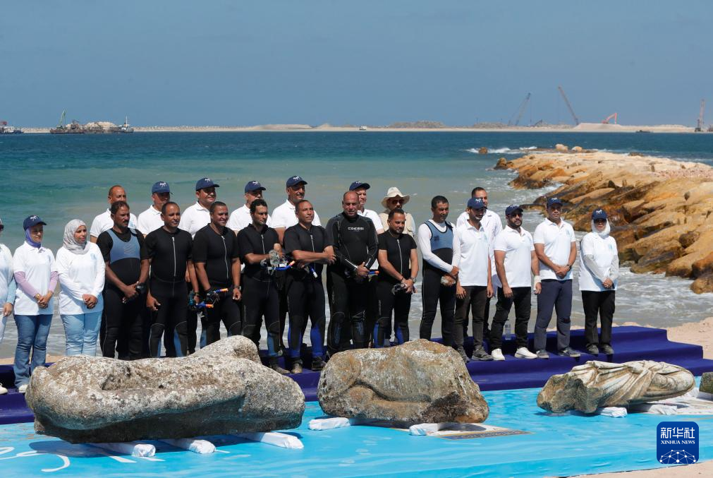 8月21日,在埃及亚历山大附近的海滨,文物工作者和打捞队员与打捞出水的石刻雕像合影。
