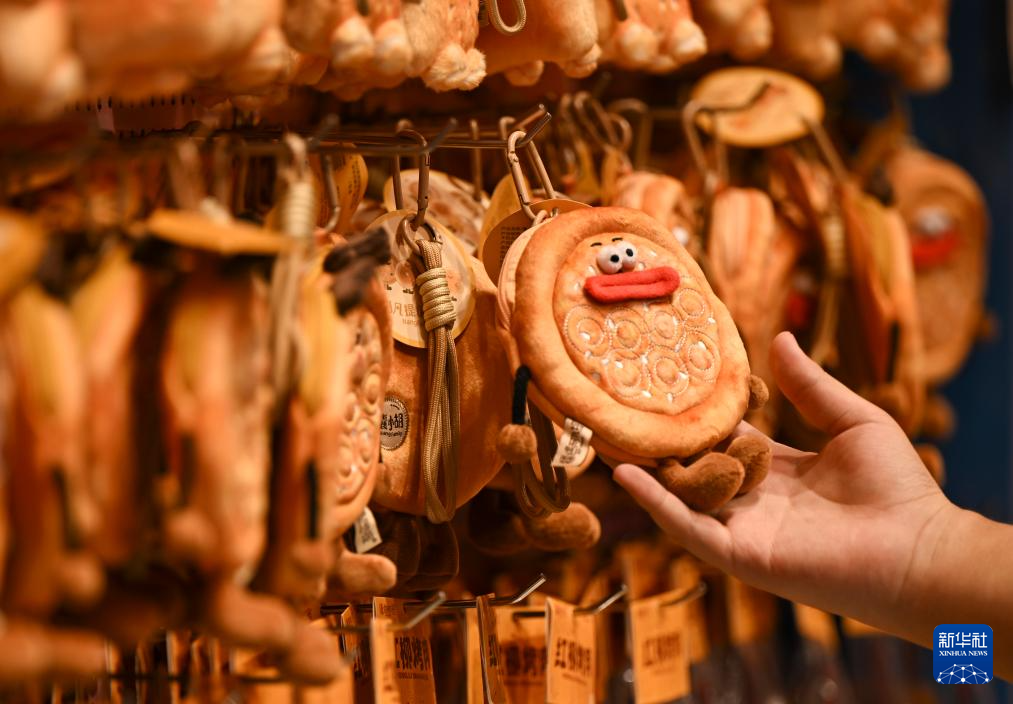 8月21日,游客在乌鲁木齐大巴扎步行街一家文创店选购馕主题的文创产品。