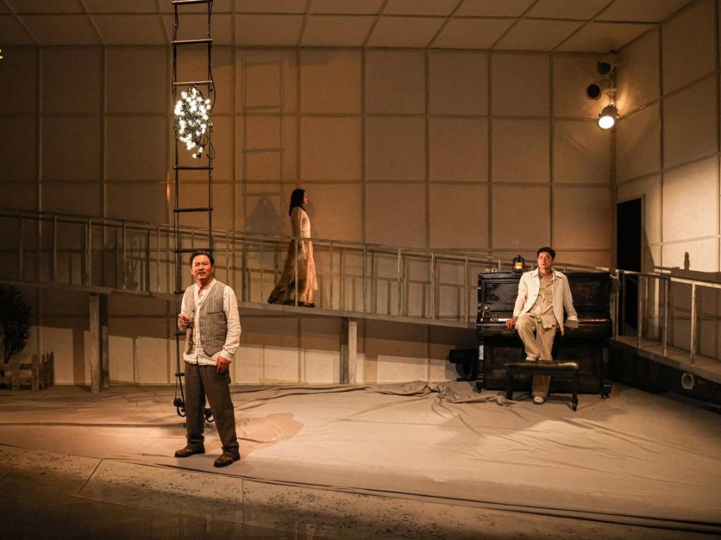据介绍,舞台设计采用写意风格,象征海边浅滩的水洼与象征家庭环境的陆地中,仅陈设孤舟、钢琴、软梯等少量道具,展现原著中“雾”的意象,营造朦胧的戏剧氛围。