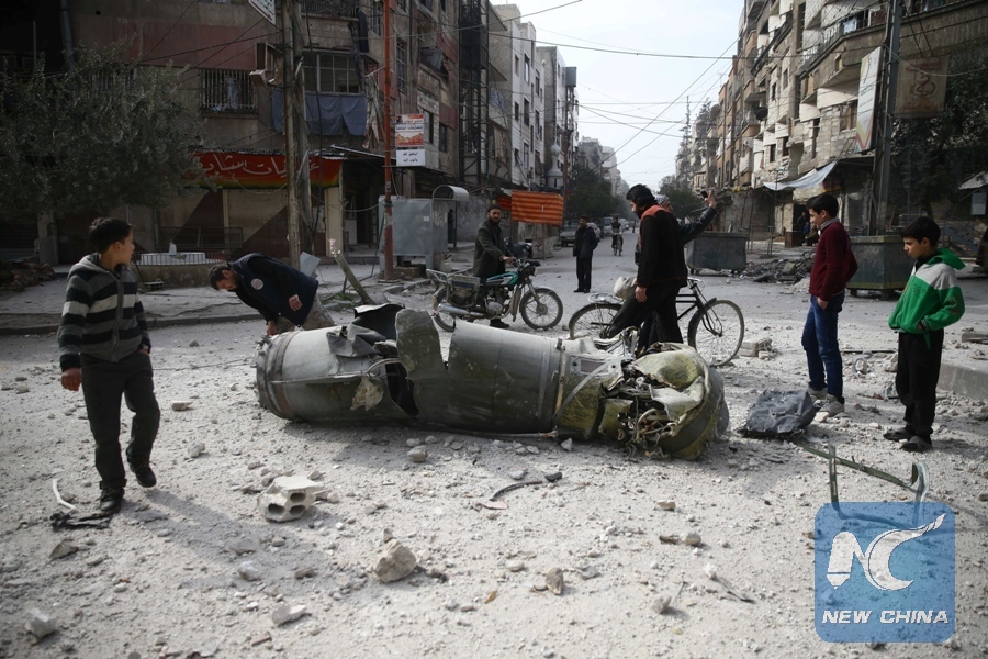 People inspect missile remains in the besieged town of Douma, in eastern Ghouta, in Damascus, Syria, Feb. 23, 2018. (Xinhua/REUTERS)