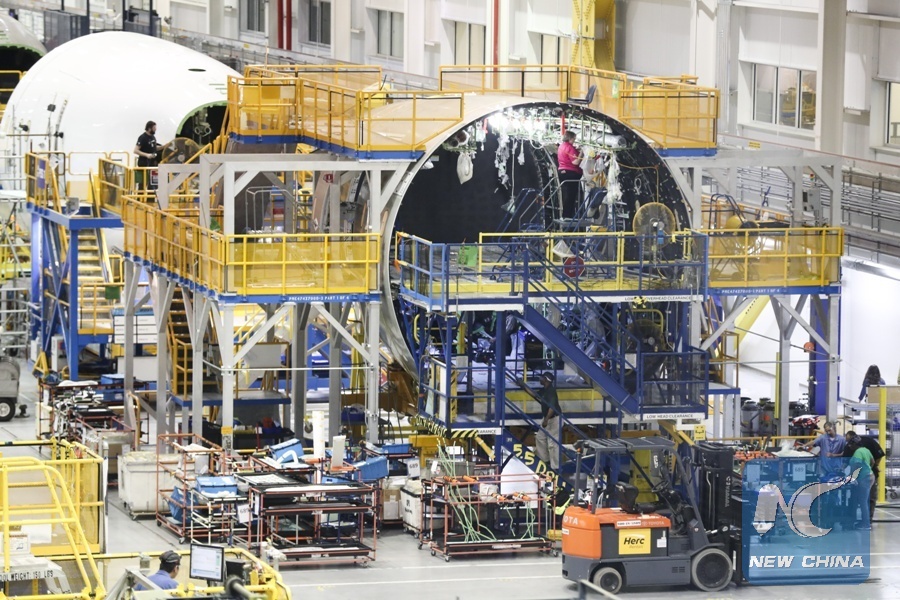 Photo taken on Jan. 26, 2018 shows interior of the afterbody production buliding in Boeing South Carolina in North Charleston, South Carolina of the United States. With around 7,000 employees, the factory is the second Boeing facility for the final assembly of 787 Dreamliner planes. (Xinhua/Wang Ying)