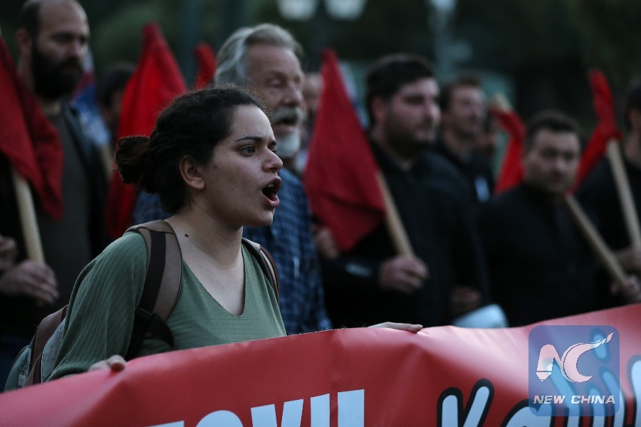 A demonstrator shouts slogans during a protest against a coalition missile strike in Syria launched by the U.S., France and Britain, in Athens, Greece, on April 17, 2018. (Xinhua/Marios Lolos)
