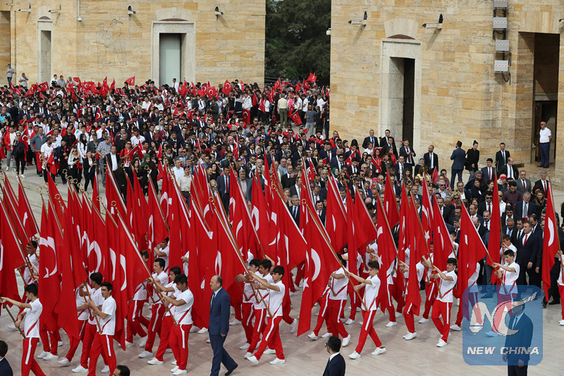 Turkish students hold national flags in the ceremony at Anitkabir, Ataturk's mausoleum, in Ankara,Turkey, on May 19, 2018. (Xinhua)