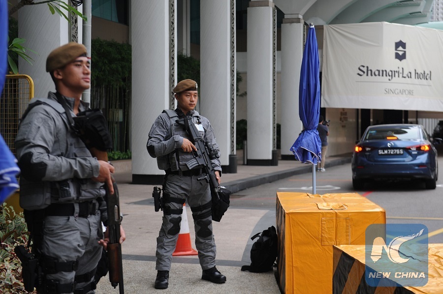 In this file photo, singapore police are on duty outside the Shangri-La Hotel in Singapore on Jun 2, 2017. (Xinhua/Then Chih Wey)