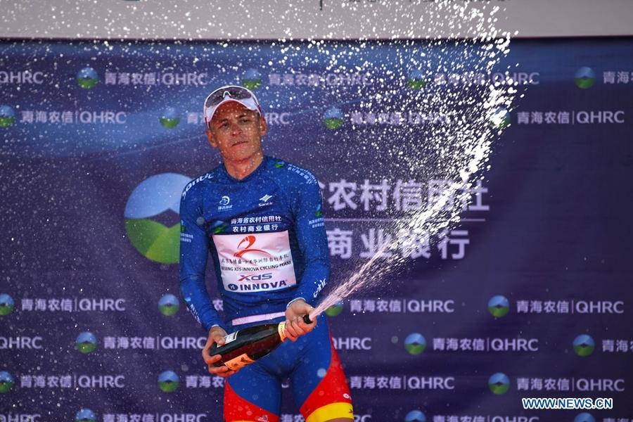 Kazakhstan's Ilya Davidenok (Beijing XDS-Innova)?celebrates?with blue jersey for best Asian Cyclist at the award ceremony of the tenth stage of the Tour of Qinghai Lake in northwest China’s Gansu Province, on August 1, 2018. (Xinhuanet Photo by Yang Shoude)