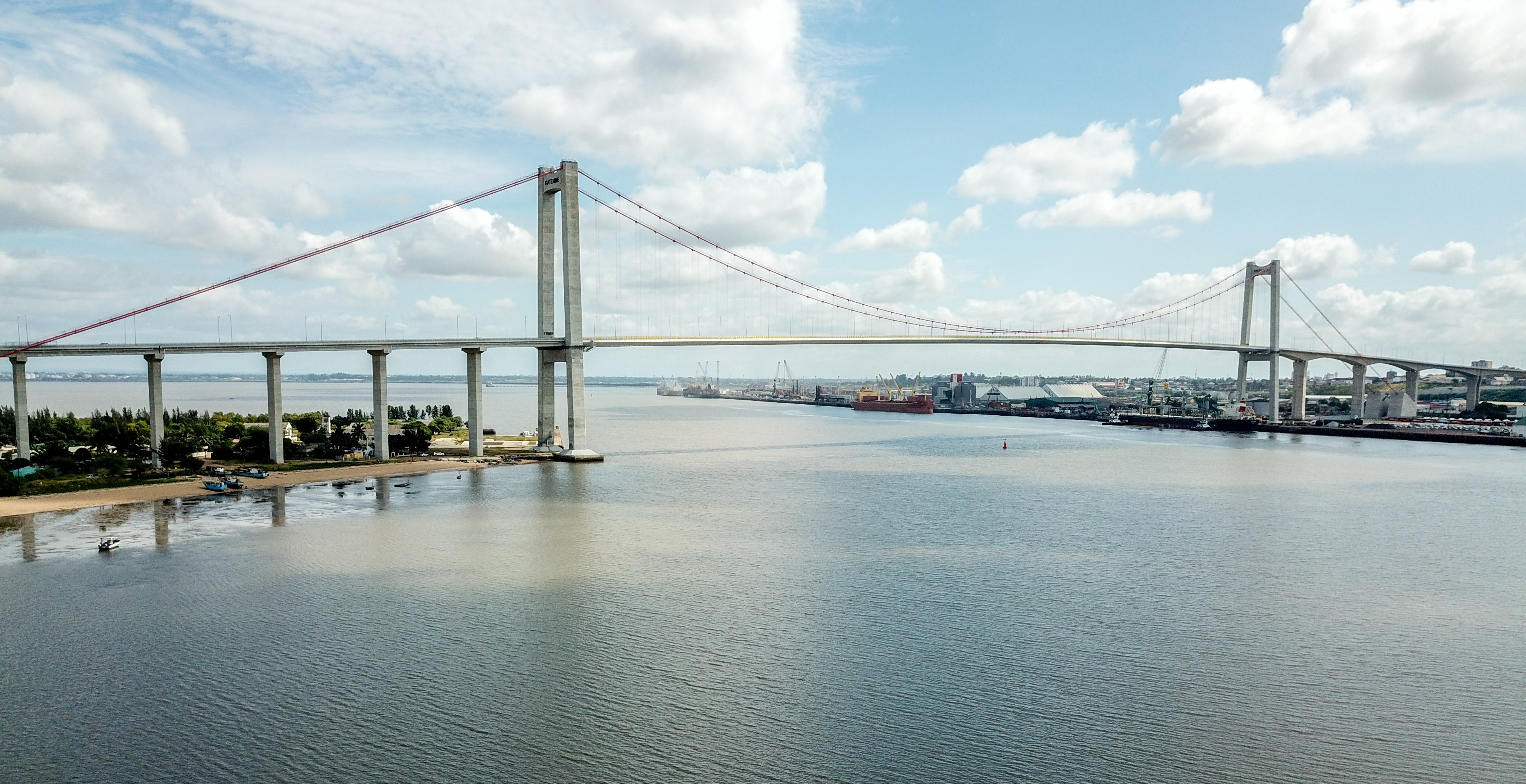 Aerial photo taken on April 8, 2019 shows the Maputo Bay Bridge in Maputo, Mozambique. The bridge is part of the Maputo Bridge and Link Roads project built by the China Road and Bridge Corporation, with Chinese standards and financing support. (Xinhua/Zhang Yu)