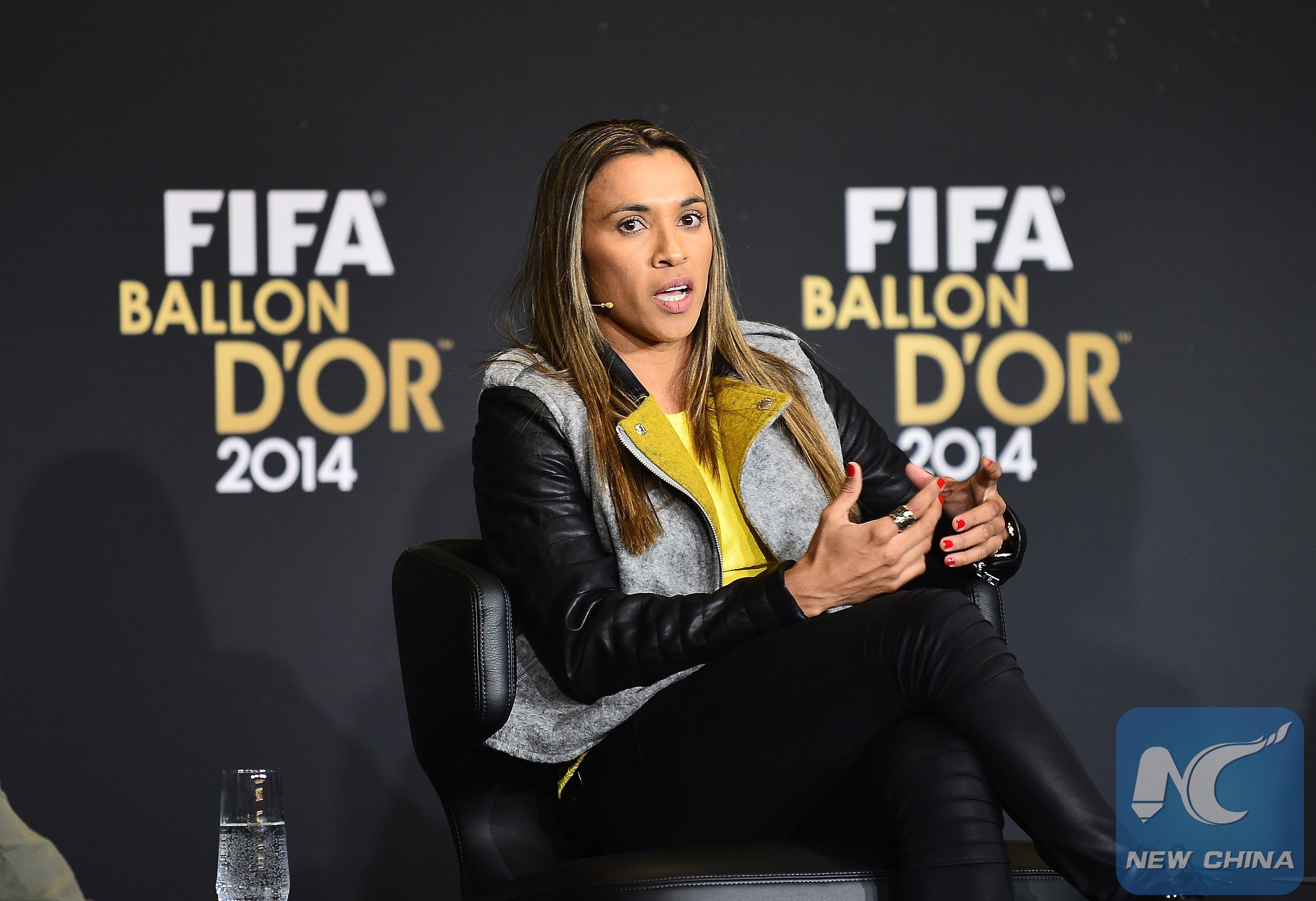 Brazilian player Marta Vieira Da Silva participates during a press conference prior to the Golden Ball award ceremony in Zurich, Switzerland, on January 12, 2015. (Xinhua/Marcio Machado/ZUMAPRESS)