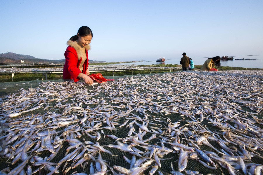 Fish farmers dry lake anchovies by the side of Poyang Lake near the Yinshan Island in Duchang County, east China's Jiangxi Province, Nov. 28, 2018.(Xinhua)