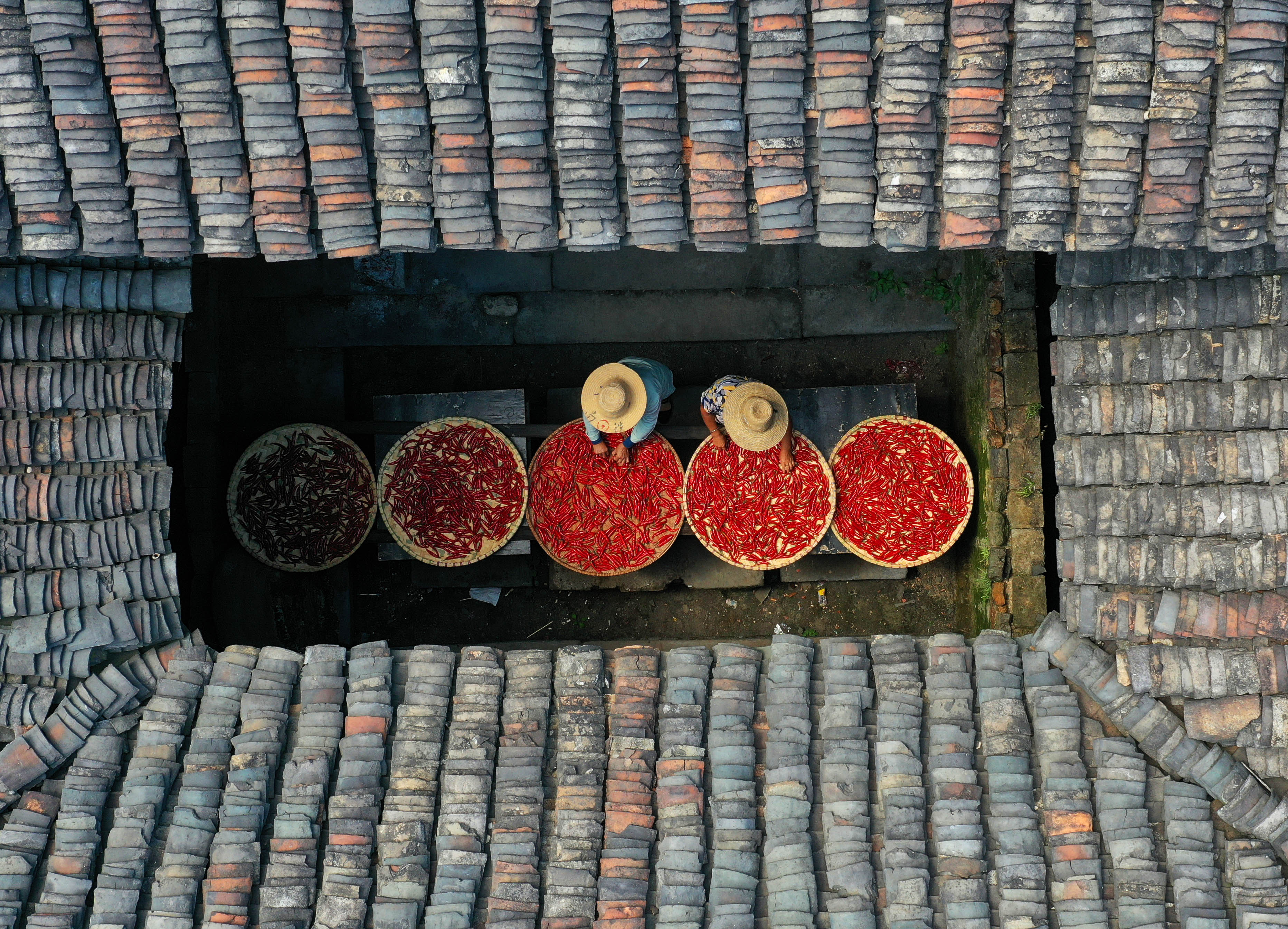Aerial photo taken on Sept. 22, 2019 shows villagers drying chili peppers at Xiachong Village of Luoqiao Town in Changning City, central China's Hunan Province. (Photo by Cao Zhengping/Xinhua)