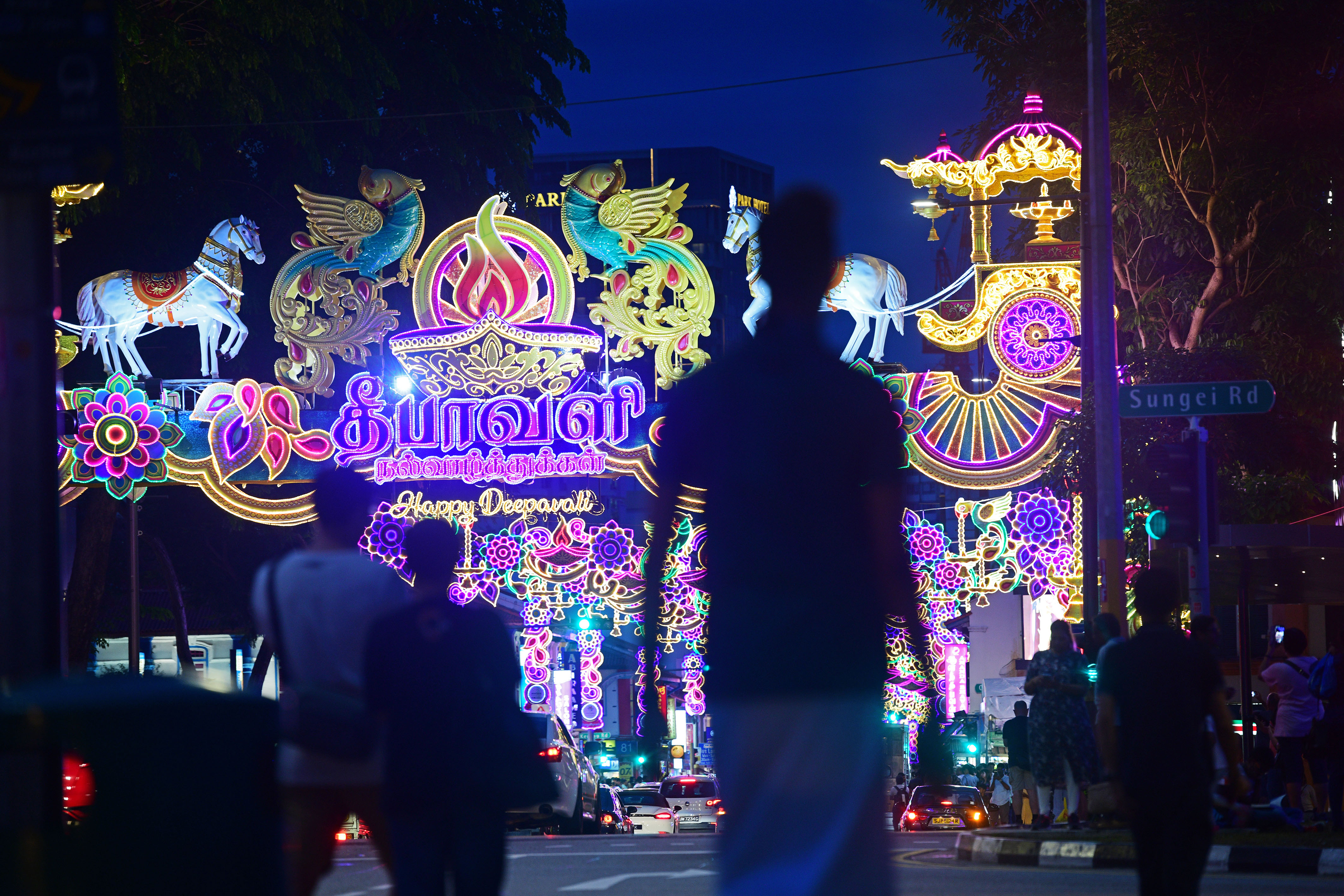 Deepavali Festival lights illuminate a road along Singapore's Little India on Oct. 26, 2019. (Xinhua/Then Chih Wey)