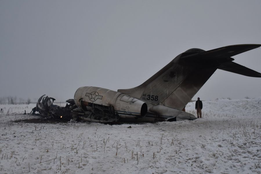 Photo taken on Jan. 27, 2020 shows the wreckage of the crashed plane in Deh Yak district of Ghazni province, Afghanistan. The Afghan Taliban claimed Monday that its fighters shot down a U.S. forces' aircraft in eastern Ghazni province. The U.S. military said on Monday that it is monitoring the situation following reports of a U.S. aircraft crash in Afghanistan. (Photo by Saifullah/Xinhua)