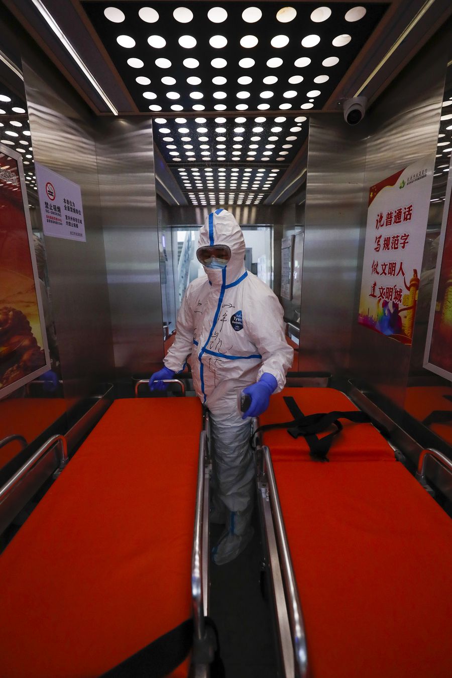 Xue Kaihua, an ambulance driver from Shanghai Medical Emergency Center, takes an elevator to transfer patients with stretchers after he arrives at a hospital affiliated to Wuhan University of Science and Technology, in Wuhan, central China's Hubei Province, March 14, 2020. (Xinhua/Shen Bohan)