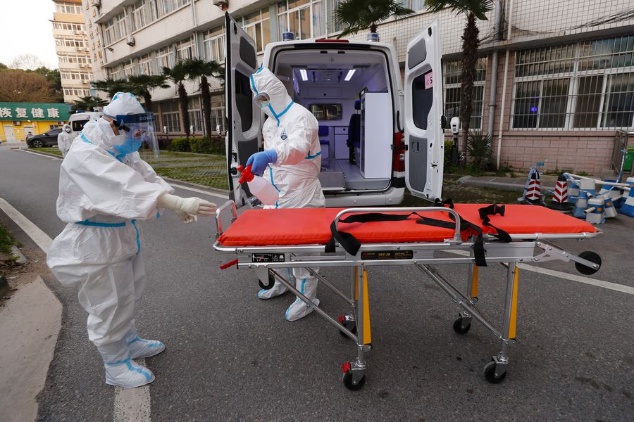 Medical transfer teams from Shanghai and Inner Mongolia get ready to transfer patients from a hospital affiliated to Wuhan University of Science and Technology, in Wuhan, central China's Hubei Province, March 14, 2020. (Xinhua/Shen Bohan)