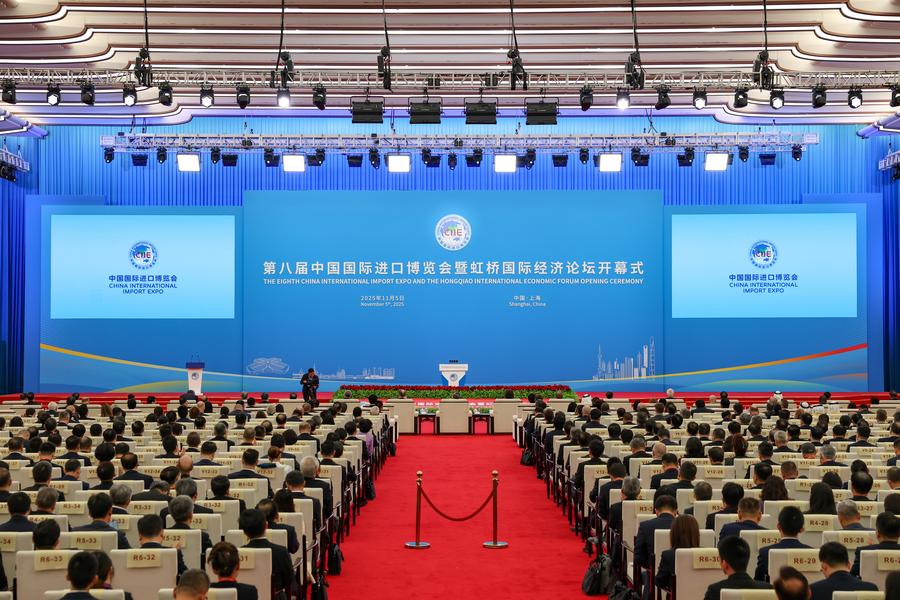 This photo taken on Nov. 5, 2025 shows a scene at the opening ceremony of the eighth China International Import Expo (CIIE) and the Hongqiao International Economic Forum in Shanghai, east China. (Xinhua/Wang Zecong)