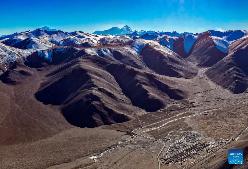 An aerial drone photo taken on Nov. 12, 2025 shows the reconstructed houses (those nearer to the Mount Qomolangma) that have been delivered to residents at Yejiang Village of Dingri County, Xigaze City, southwest China's Xizang Autonomous Region. In early January, a 6.8-magnitude earthquake struck Dingri County in the city of Xigaze, leveling thousands of houses.