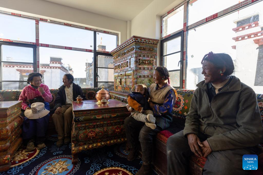 A villager (2nd L) hosts neighbors in her new house in Gyabug Village of Dingri County, Xigaze City, southwest China's Xizang Autonomous Region, Oct. 24, 2025. In early January, a 6.8-magnitude earthquake struck Dingri County in the city of Xigaze, leveling thousands of houses.