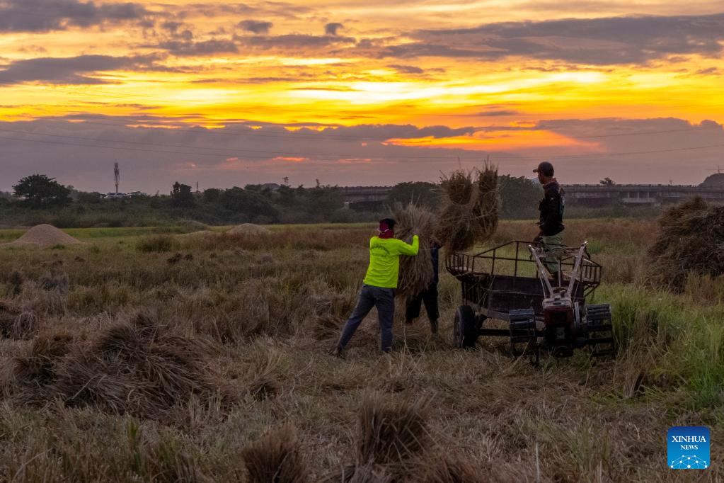 An aerial drone photo taken on Nov. 2, 2025 shows farmers harvesting rice in a rice field in Vientiane, Laos. Local farmers have recently been busy harvesting the rice as the harvest season comes. (Photo by Kaikeo Saiyasane/Xinhua)