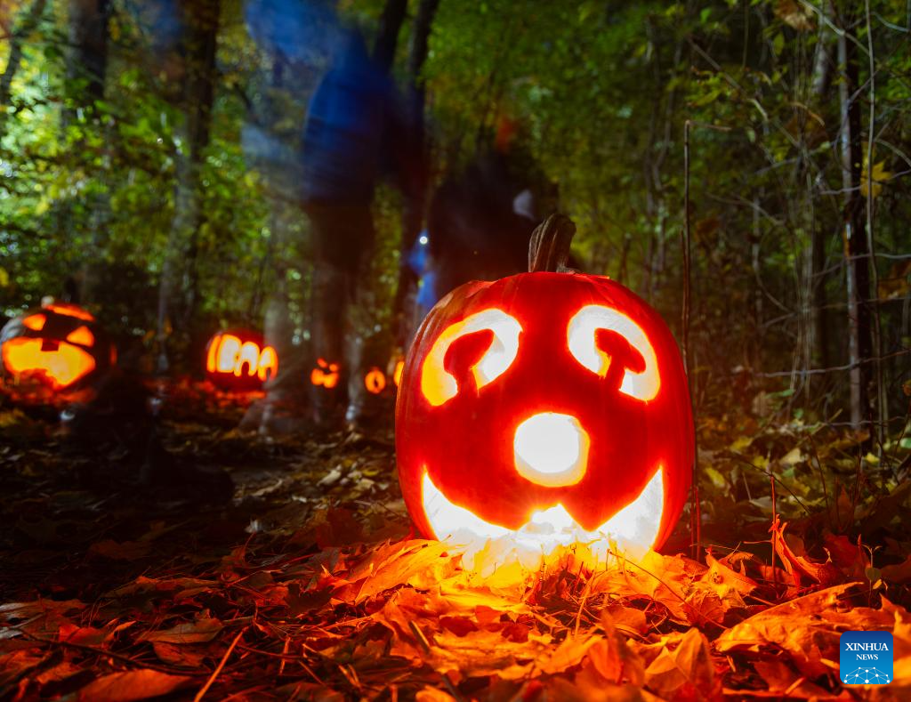 A Jack-O-Lantern is seen during a pumpkin parade event in a park in Mississauga, Ontario, Canada, on Nov. 1, 2025. (Photo by Zou Zheng/Xinhua)