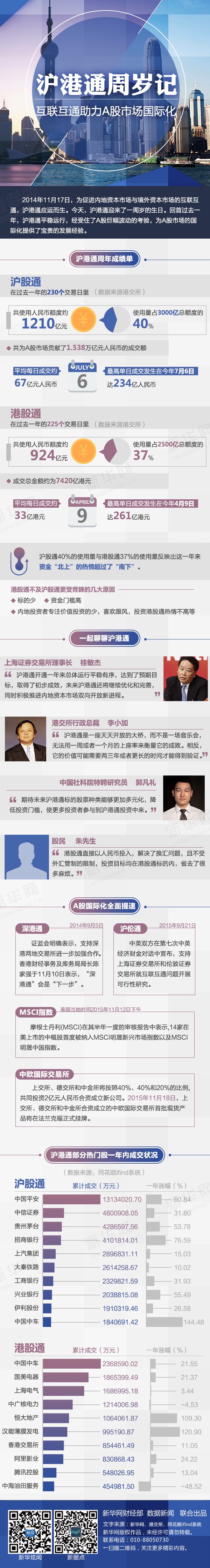 ????過去的一年,滬港通取得了從無到有的突破,內(nèi)地股市首次向全球資金直接開放,而內(nèi)地的投資者也開始全球配置資產(chǎn)。正如港交所行政總裁李小加所述,“滬港通在過去一年中運作平穩(wěn)、交易結(jié)算機制不斷完善。”