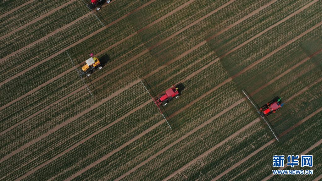 噴霧機在河北省辛集市試炮營村麥田里進行除草作業(2020年3月17日攝,無人機照片)。
